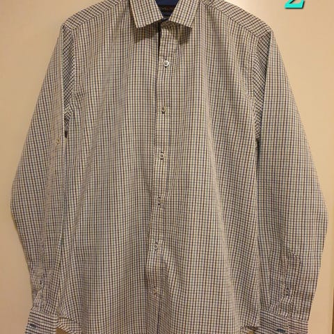 Vintage, beige, teksturert bomullskjorte med blant annet brune og grønne striper. Langarmet og fullkneppet. 1 brystlomme. 100% bomull.