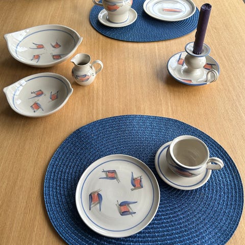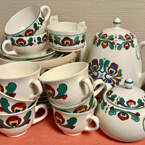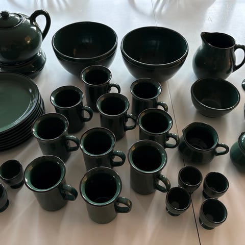 Sett med 12 store kopper til suppe eller annen drikke, en mugge, to skåler, en vase og to par salt- og pepperbøsser. Vintage håndlaget keramikk fra AS Trifa, som holdt til i Halden fra 1969 til 1977. Designet av den nederlandsk-norske keramikeren Otto Mulders (1927-1994).