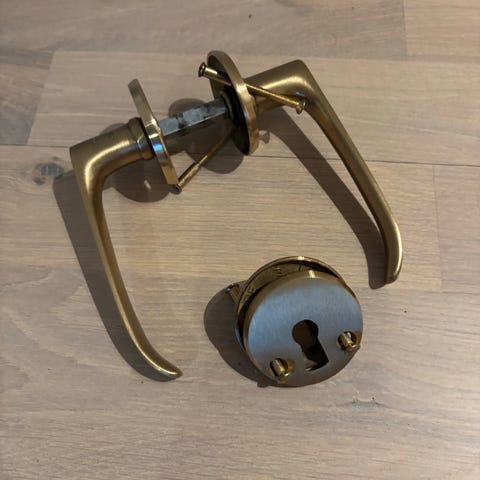 14 stk messingskruer for dørskilt, beslag og vurdere. Skruene kan kappes for å korte inn. Hylse på skruehodert en side med glatt utside og riller på krage som mothold på beslag/skilt.