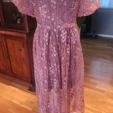 Selger en fantastisk fin kjole med blomster detaljer. Denne kjolen har jeg brukt i dåp. Konfirmasjonen og bryllup. Kan brukes fra L til XXL. Vier seg ut. Flere bilder kan sendes.