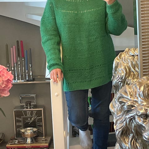 Selger en pent brukt Abby genser fra Sandnes garn. Brukt noen få ganger. Strikket i tynn Peer tynt og tynn silk mohair fra Sandnes garn. Strikket etter størrelsen M-XL. Overvidde: 150 cm. Hel lengde: 60cm