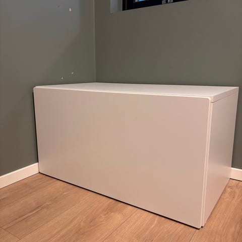 Benk med lekeoppbevaring og pute med antiskli pute.