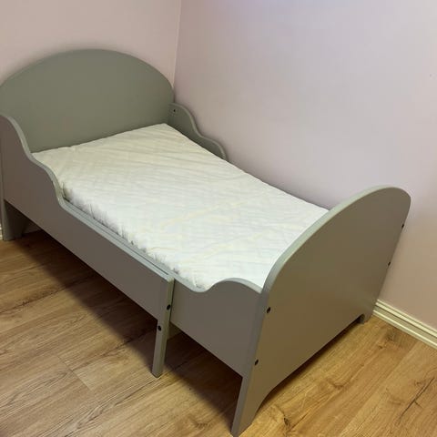 Pent brukt seng til barn fra IKEA. Noen få bruksmerker. Den kommer i tre deler. Likt konsept som de andre voksesengene på IKEA. Vokser med barna, og i grått passer den både til jenter og gutter.