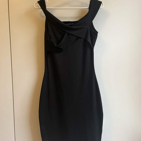Svart kort kjole med dyp utringning. Sitter kjempefint over hoftene. En skikkelig cocktail kjole