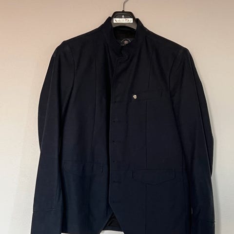 Frakken er beige, laget i bomull/polyester og meget lett.
