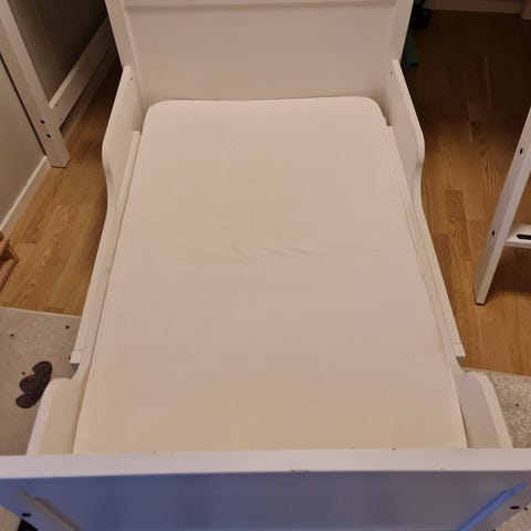 Seng og madrass frå IKEA. Praktisk justerbar storleik på både seng og madrass. Sjå bilete for mål. Nattsmyg tredelt madrass følger med. Nypris på seng er 2.295kr og madrass 1.595kr. Må hentast på Kaupanger.
