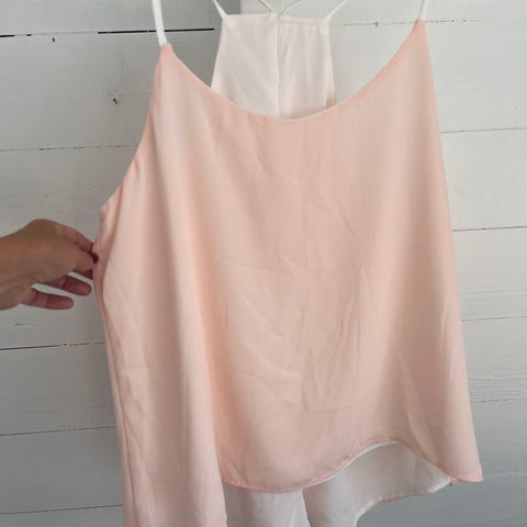 Grønn topp, pent brukt. Str s/m. Asymmetrisk nede, litt åpen i ryggen og med strass på stroppene. Må hentes i Kristiansand eller sendes om kjøper betaler frakt.