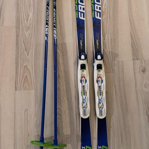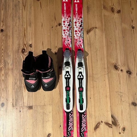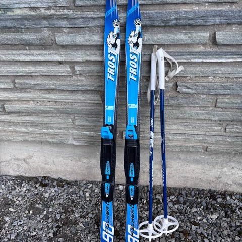 Pent brukte Fischer Frost ski og tilhørende skistaver (90 cm).
