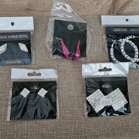 Beautiful set in rose gold colour metal with swarovski crystals. The set includes necklace and pendant, bracelet and earrings. Also included is all the packaging in the photos.