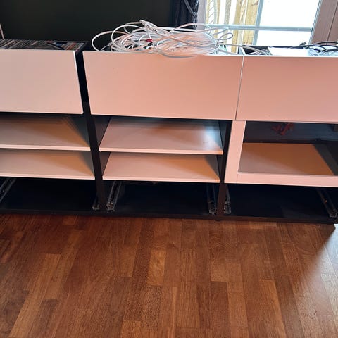 Pent brukt IKEA Bestå tv-benk med hyller og skapdører. Skapdørene er av typen Glassvik med sort glass, slik at det som oppbevares inni skapet ikke er synlig, men fjernkontrollen virker likevel gjennom glasset.
