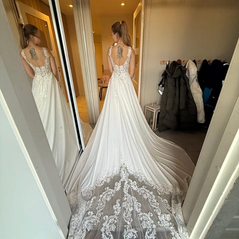Lekkert og unikt avtagbart overskjørt fra butikk Brudepikene selges, som nytt - kun prøvd på. Det passet dessverre ikke til antrekket mitt. Man kan se video av skjørtet ved bruk av QR-kode på siste bilde.