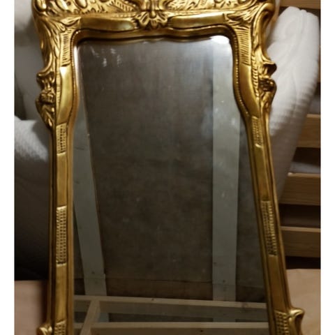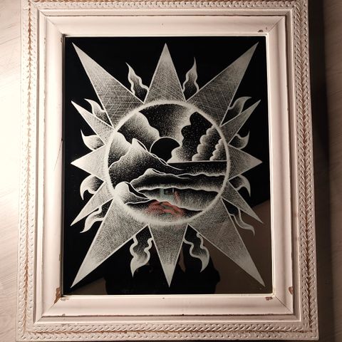 Unikt, upcycled speil med håndgravert klassisk skull & flames-motiv i en rå antikk gullramme. En perfekt kombinasjon av tattooinspirert kunst og vintage vibes.