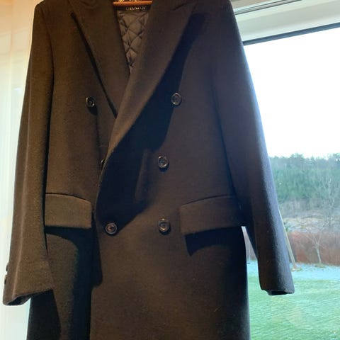 Svart kåpe i ullfleece med svart fløyelskrage selges. Størrelsen kan nok passe til medium. Jeg bruker Small og den er for stor til meg. Lang modell. På det ene bildet er fargen veldig misvisende da kåpa er svart og ikke grå.