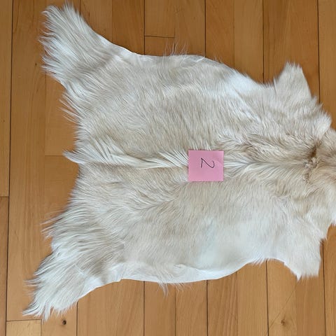 Jeg er litt usikker på hvilken type skinn dette er. Det er tynt og fint/ mykt og målene står ved bildene. Jeg har solgt noen skinn fra norsk villsau tidligere, de var en del tykkere og litt større. (Granberg garveri) Spør gjerne om det er noe du lurer på. Jeg kan sende. Skinnene er nye/ubrukte , men har aldri fått noen merke- eller pris lapp på seg.