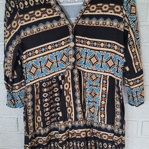 Helt ny militærgrønn, svart og hvit skjortekjole i str. L fra Vero Moda - terrazzomønster 💚🖤🤍 Lappen er klippet bort, men den er kun prøvd på og vasket en gang på finvask:) Finner dessverre ikke noen lapp med materialinfo (tror ikke jeg har klippet den bort heller), men den minner veldig om Juliet-blusene til Floyd (de er i 100% polyester). Se detaljer på bildene - har tatt bilder med mål i slutten av annonsen :)