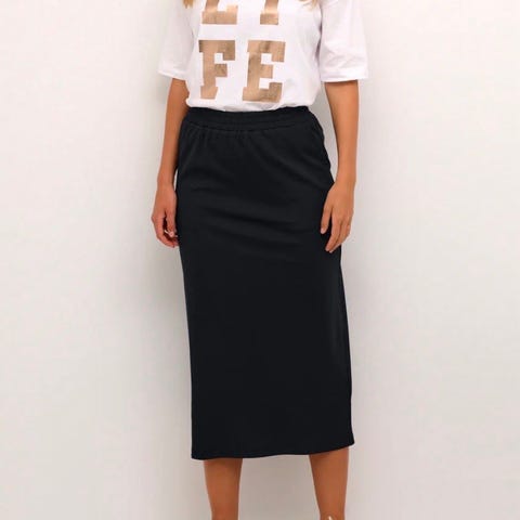 Flott sort fòret skjørt, høy kvalitet med glidelås bak, langt med splitt på den ene siden, hengt i utstilling og er ikke brukt Str 44/XL+ merke Eurofashion med veil.kr 1.300,- Selges kr 600,-(45)