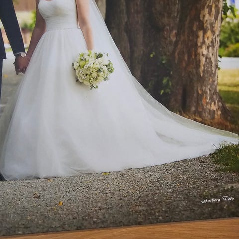 Nydelig brudekjole fra Maggie Sottero med slep str 38. Selges for 5000 ( nypris 21000). Aldri brukt grunnet feil str.