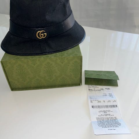 Dette er ekte Gucci Bucket Hat veldig pen brukt, kjøpt for 5 måneder siden, veldig fin for å bruke i sommer vær og den selges fordi jeg har kjøpt en annen🙂