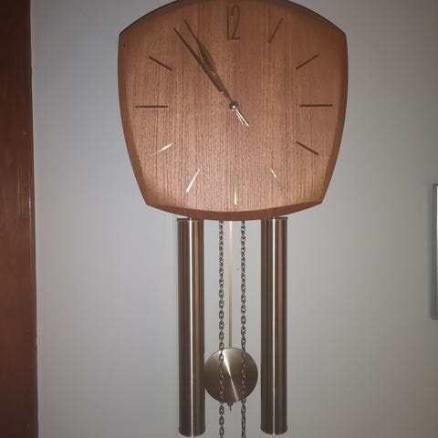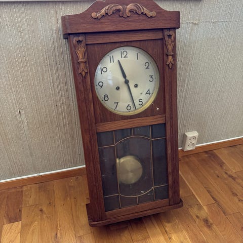 Selger en ett flott veggur / bestefarsklokke med kieninger urverk. Trekkes opp med "nøkkel". Den er nummerert 4/68. Pendelen må festes på nytt og urverket fungerer som det skal. Den ser fin ut i trekassen men noen små detaljer på tredekorasjonene er skadet. Dette har ikke noe å si for funksjonen.