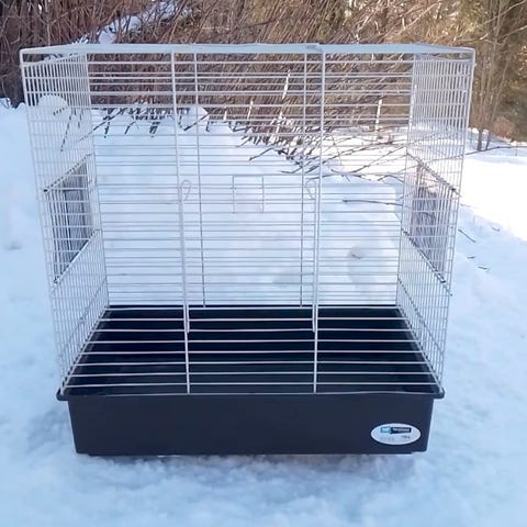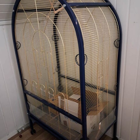 Hvit fuglebur med utstyr