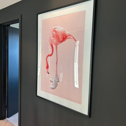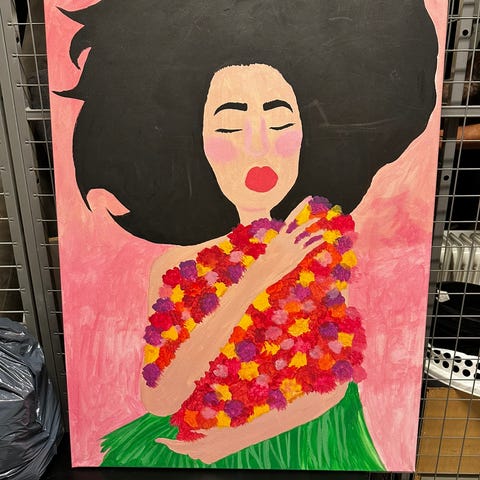 Bakgrunnen er malt med sterke pensel- og palettstrøk i nyanser av rød, rosa og magenta, mens teksten og figuren står ut med lysere kontraster og en matt finish. Dette er et moderne blikkfang perfekt for hjem, kontor eller galleri – og en samtalestarter som gir rommet personlighet.