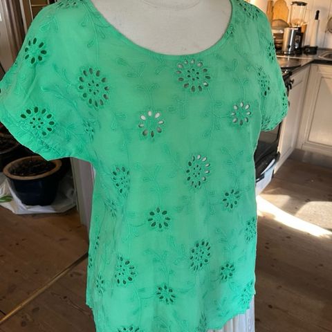 Blå kortermet tøff bluse / topp fra Tory Burch - ca str. M. Foret topp med perforert /blondeaktig bomullsstoff. Legg bak i ryggen.