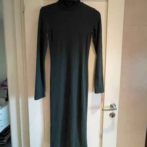 Veldig fin høyhalset kjole i dyp grønn; Bildene viser ikke frem fargen skikkelig. Kjolen har glidelås på baksiden og rekker til over knærne. Kjolen er aldri brukt, da den dessverre ikke passet.