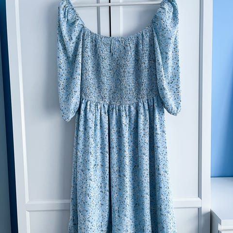 Lett og ledig, kort sommerkjole i pent lyseblått stoff. Den har strikk i ermer og i livet.