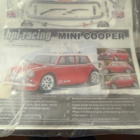 Bl.a Tamiya M-03L Mini Cooper. Uten elektronikk og usikker på absolutt alt er på plass, men det meste ser det ut til. Dekalene med nr 23 på det ene bildet følger med.