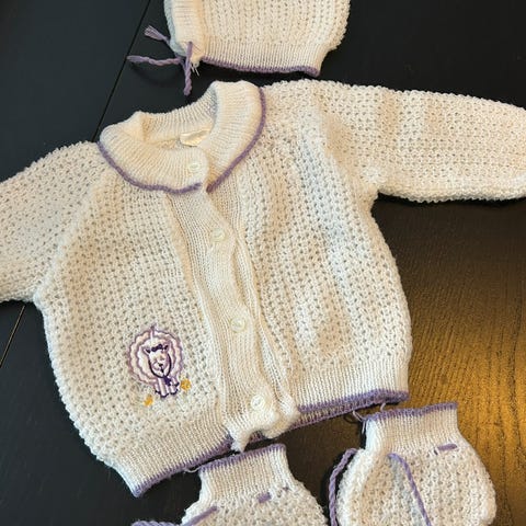 Hjemmestrikket jakke til barn. For mål, vennligst se bilder. Hentes i Vika eller sendes - kan også sendes utenom Finn om ønskelig.