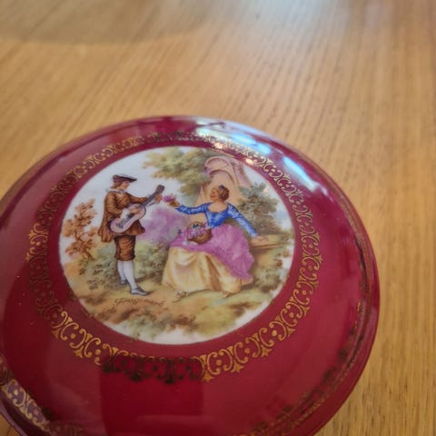 Selger en nydelig skål, Bavaria fra Winterling. Den har en størrelse på 16 x 7 cm, med en diameter øverst på 12 cm. Fargen er hvit med delikate rosa og gull blomster, noe som gir den et elegant og tidløst utseende. Tilstanden er pent brukt, og den har blitt godt tatt vare på. Perfekt for deg som ønsker å tilføre litt klassisk sjarm til hjemmet ditt. Ta kontakt ved interesse!