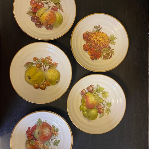 Seks eldre frukt asjetter uten stempel med gullkant og fine frukt motiv. 🍇 Lite brukt