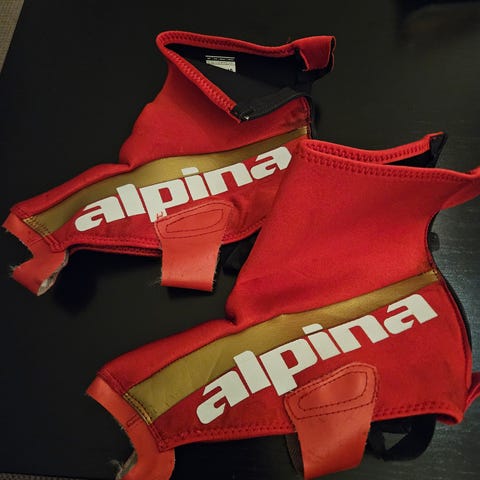 Alpina skotrekk for langrennsko. Slitasjemerker på gummi under, men veldig mye skotrekk igjen.