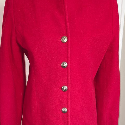 Ulljakke 80% lana ull. Str. 48 Rød fargen er litt mørkere enn på bildene. Pent brukt. Har et lite bruksmerke foran (siste bilde).