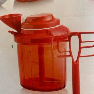 Den perfekte kjøkkenmaskin som ikke krever strøm. Hakker grønnsaker( ikke harde) visper dressinger, majones, kremfløte osv. Fin å bruke hjemme, på terrassen, i båten på campingen. 1,35 liter.