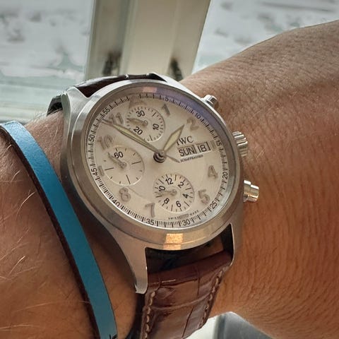 Kommer med boks (litt sliten innvendig), sertifikat, kvittering fra service i 2023 og mva kvittering. Forrige eier byttet den til seg fra en brukthandler i utlandet, og mva-kvitteringen er derfor på mellomlegget som ble betalt.