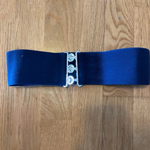 Strikkbelte med mange små felt av fløyel og sotet blank hempe. Lite og pent brukt. Lengde 75 cm. Selges kr 150.