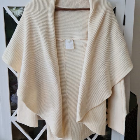 Nydelig jakke i myk merinoull selges. Lilla farge, to lommer i front.
