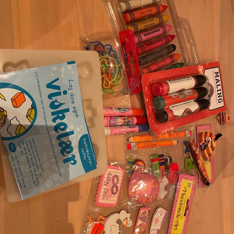 Blant annet ballongmaskin til å lage kule figurer, morsomt familiespill, scrapbooking, magasiner og masse hobbyartikler.