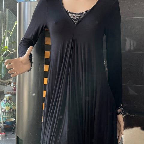 Flott kjole fra NÖR. Mange tøffe detaljer. Se bilder. Brukt 1 gang. M. Lengde 112, bryst 45x2. Helt svart.