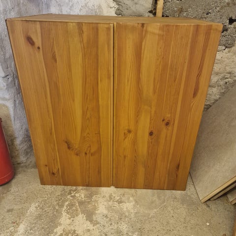 2 helt nye mørkebrune dører til baderomsskap, Inkl. messing håndtak og oppheng. Merke Svedbergs. Bredde 31 cm, høyde 57 cm.
