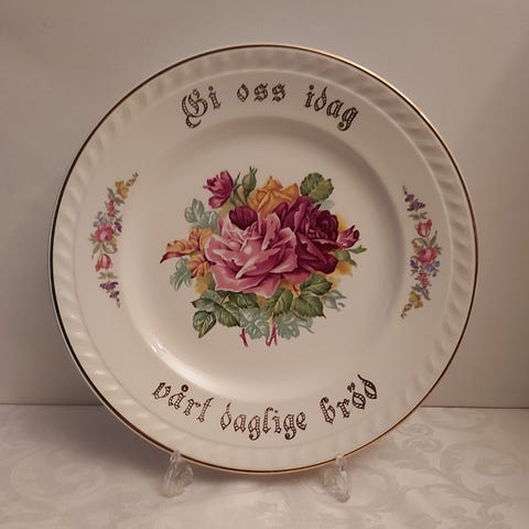 Rundt fat 28 cm med teksten"Gi oss i dag vårt daglige brød", fra Stavangerflint Norway.