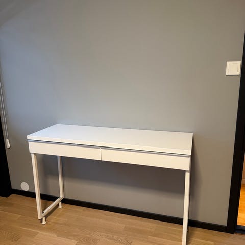 Pent brukt bestå skrivebord fra IKEA med glassplate. Kommode på hjul under kan medfølge mot vederlag.