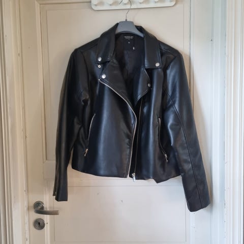 Helt ny, stilig skinnjakke (imitert skinn/ PU) med avtagbar hette og dobbel glidelås. Størrelse XL. Selges med lapp på da jeg kjøpte feil størrelse. Se bilde.