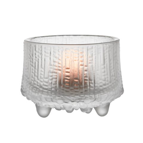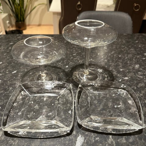Sett med to blå glass lysestaker med unikt formet design. Lysestakene er laget av glass og har en dekorativ funksjon som passer til borddekorasjon. Hver lysestake har plass til ett telys.