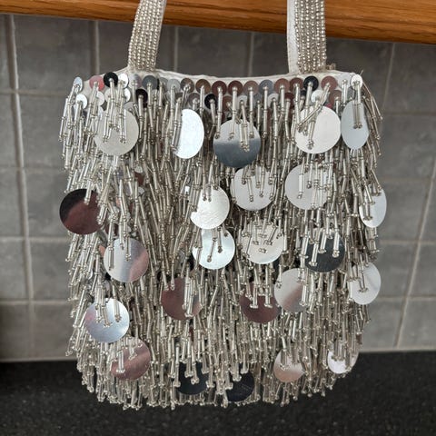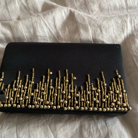 Pen selskapsveske med perler og strass. Vesken har aldri vært i bruk og fremstår som ny. Kan brukes med lenken både dobbel og enkel. Dermed kan den brukes som både skulderveske og håndveske.