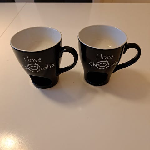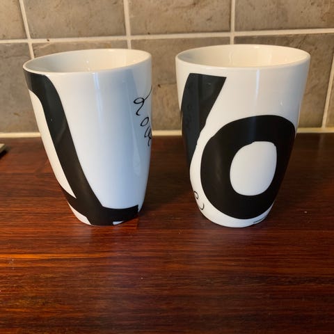 2 store Coffee krus som er 14 cm høye og 9,5 cm bred. Selges for 20,- pr stk