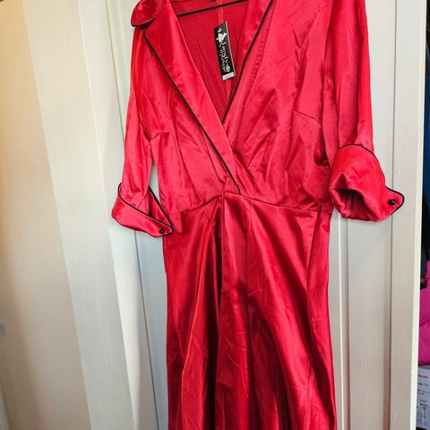 Selger denne nydelige retroinspirerte kjolen fra Lady V London. Den er sort med elegante røde detaljer på krage og ermer noe som gir den et klassisk og sofistikert uttrykk.
