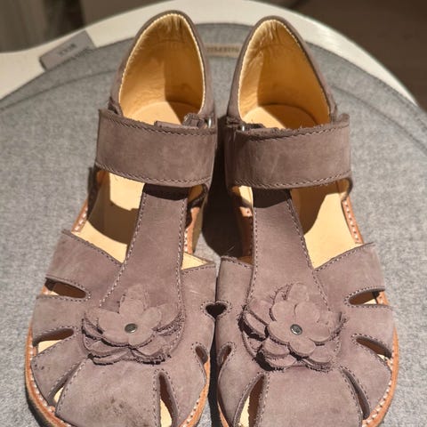 Fine brune Angulus sandaler selges. Litt skrap framme på ene og den vanlige mørke fargen under sålene som dette merket ofte får.