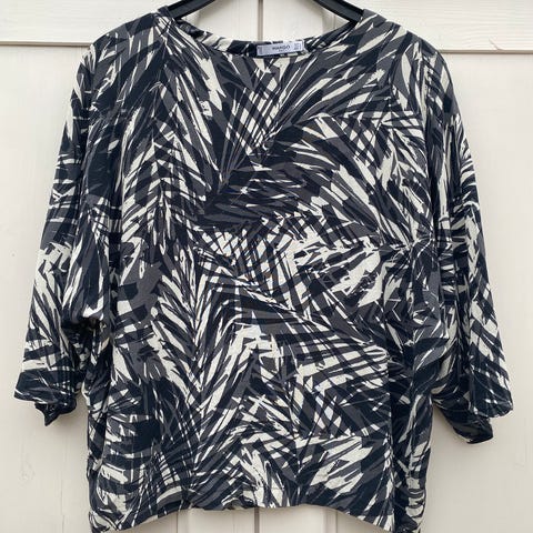 Toppen skjuler magen godt da den har dobbelt stoff foran. Stoffet er blankt, mykt og trolig i polyester. Lapp er klippet bort.